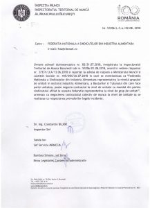 Reamintim că, in ciuda decizilor judecătoresti, dar si a adreselor transmise in ultimii ani, ITM Bucuresti se sucește cu 180% si sustine acum ca Federatia Nationala a Sindicatelor din Industria Alimentara nu este reprezentativa la nivel de unitate, incalcând astfel flagrant deciziile instanței si propriile decizii.